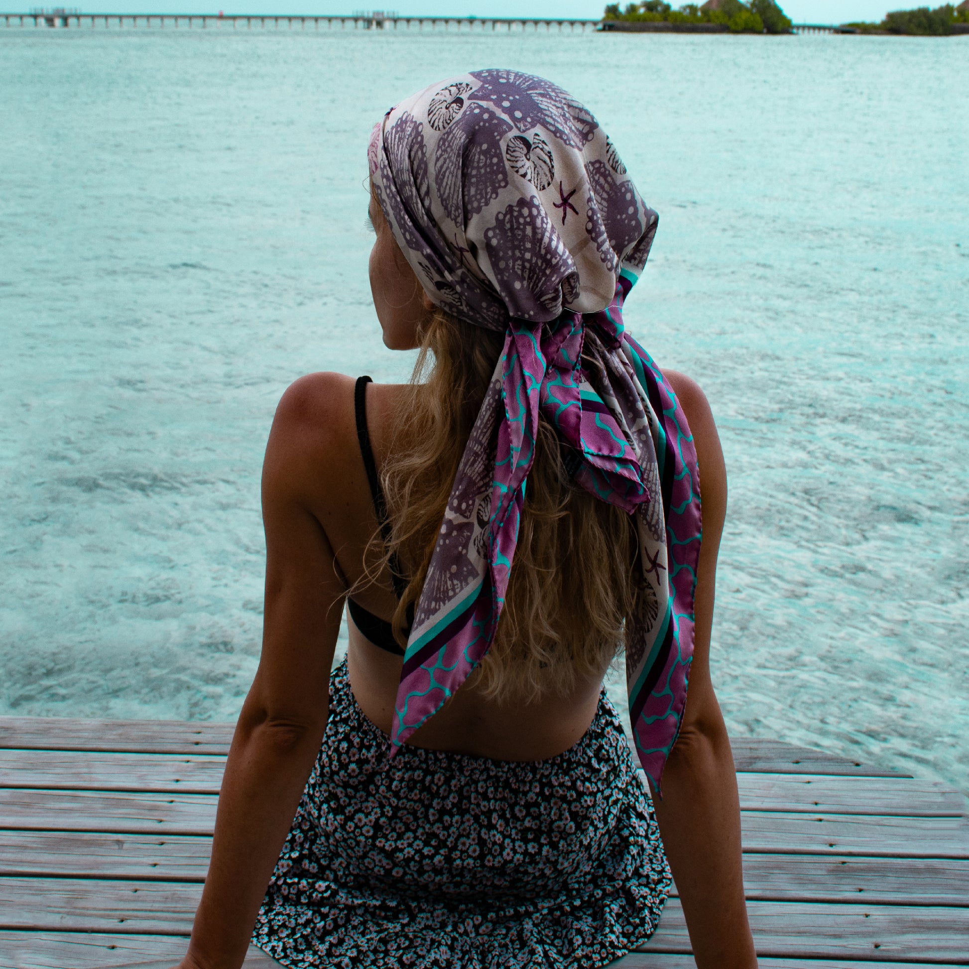 The intricate illustrations of sea shells and the starfish evoke a sense of natural beauty and serenity, capturing the essence of the ocean in every stroke. Whether draped elegantly around your neck or tied as a headband, this scarf adds a touch of aquatic whimsy to any ensemble.
