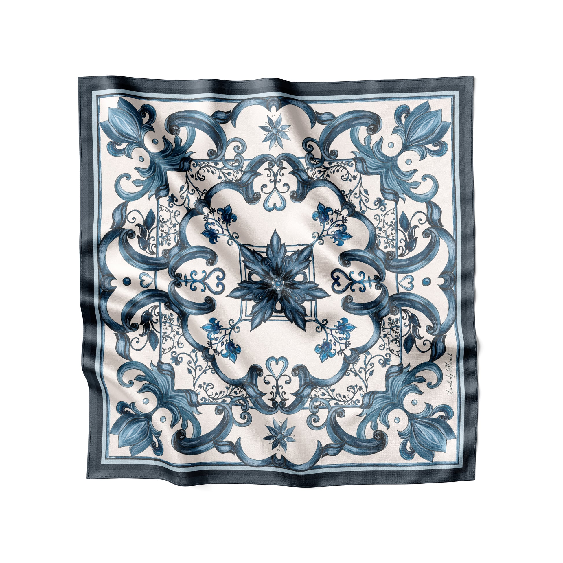 "Blue Majolica" is inspired by the timeless beauty of Mediterranean tiles. This silk scarf is painted in deep shades of blue reminiscent of the Amalfi coast and the iconic Dolce & Gabbana ceramics. Each brushstroke captures a piece of Italian elegance. Sun, sea, and centuries of craftsmanship woven into one luminous design.